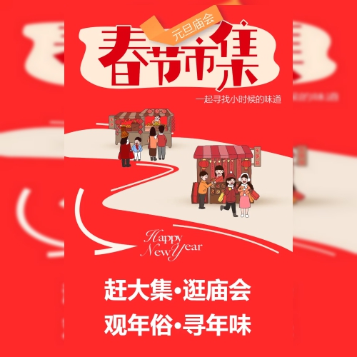 红色卡通扁平春节市集庙会活动
