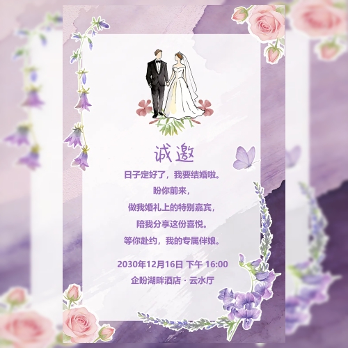 婚礼伴娘紫色花卉手绘邀请函