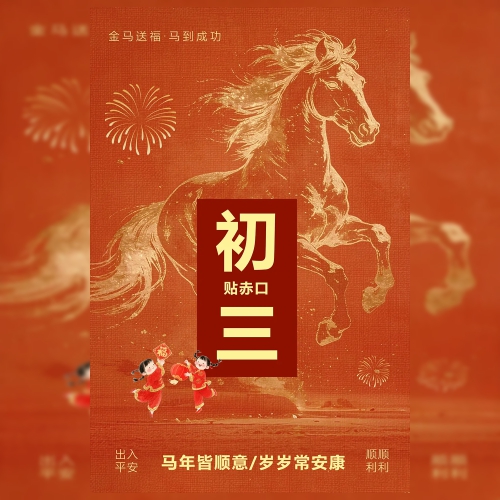 红金中国风马年春节大年初三祝福问候海报
