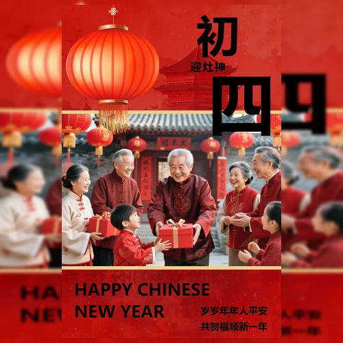 红色简约创意春节年俗大年初四海报