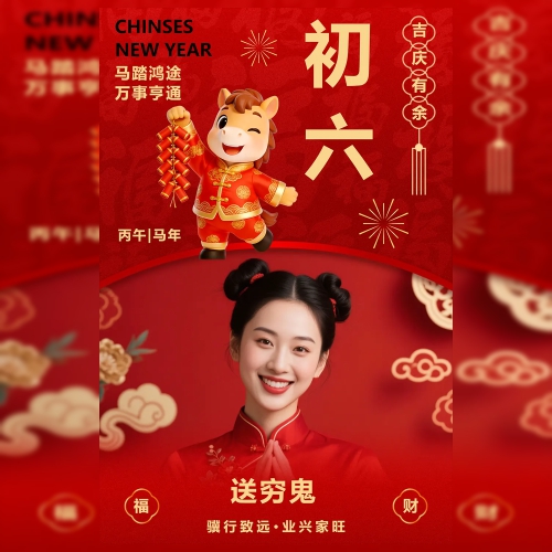 喜庆红金马年春节年俗大年初六祝福问候海报