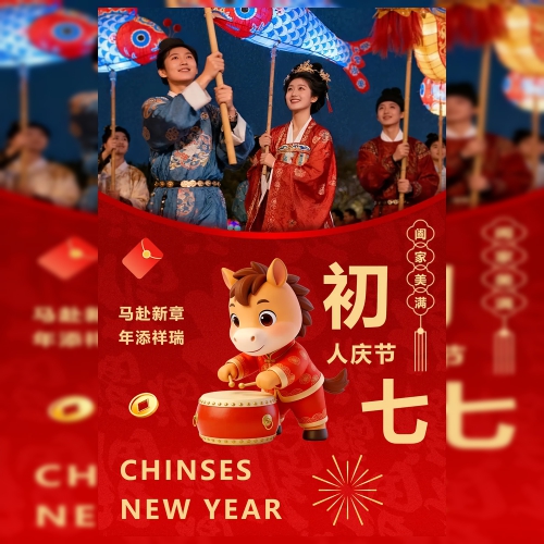 喜庆红金马年春节年俗大年初七祝福问候海报